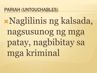 Pinaka-mababa sa caste system kinabibilangan ng naglilinis ng kalsada nagsusunog ng patay at nagbibitay ng kriminal Polytheism Ang relihiyon ng Kabihasnang Indus kung saan naniniwala sila sa maraming Diyos at sa mga bagay. Pinuno ng Persia na sumakop sa Indus. Philippines asiaConnect with us in our Facebook Page-----.