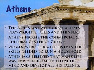 Kabihasnang Mycenaean 8192014 sir_rj 12 12. May pangunahing layunin na magpalakas ng mga katawan upang ipagtanggol ang kanilang lungsod estado. Naabot ng Athens ang pinakamataas na antas ng kabihasnan sa larangan ng politika at kultura sa silangang Mediterranean ngunit bumasak pa rin ito.