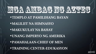 Kasabay nito ang ibat ibang bagay na katumbas ng napakalaking halaga kabayarang hinihingi sa mga bagong sakop ay bumuhos sa mga kaban ng Aztec. Kabihasnang Maya 1. Kabihasnang Aztec Mga nomadikong tribo na ang orihinal na na pinagmulan ay hindi tukoy.